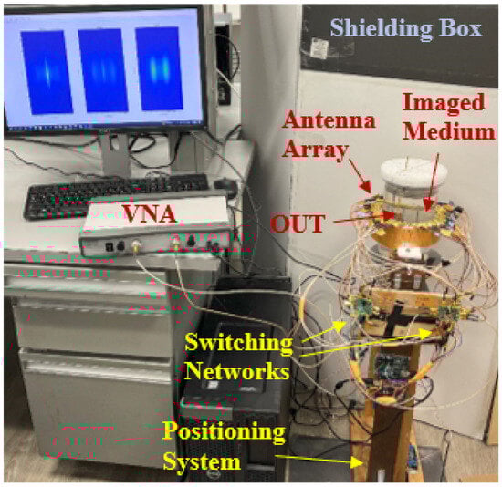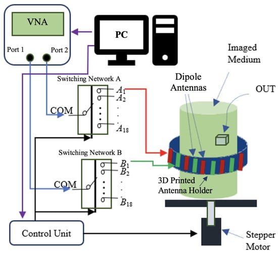 Figure 6 illustrates the block diagram of the proposed imaging system. As shown, it consists of an array of antennas and two switching networks A and B to select the antennas, as discussed in Section 2. The array elements are mini GSM/Cellular Quad-Band antennas from Adafruit []. These antennas are a practical, affordable, and technically suitable choice for this microwave imaging system. They operate around 1.5–1.8 GHz, which matches the imaging system’s narrow-band frequencies and allows effective penetration into the glycerine–water medium. Their small size makes it easier to arrange many antennas around a cylindrical setup, achieving higher angular sampling rate. Also, we employ an Anritsu VNA, ShockLine-MS46122B model, for the measurements.