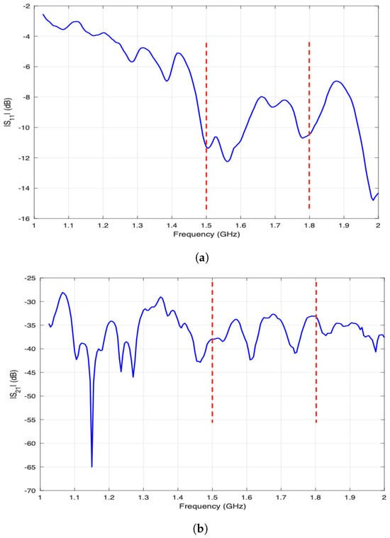 Figure 7 shows the variation in the scattering parameters of the antennas. As depicted, Figure 7a shows the variation in the reflection scattering parameter for a sample antenna placed inside the antenna holder and in contact with the liquid container, while Figure 7b shows the variation in the transmission scattering parameter measured for two sample antennas located at the opposite sides of the liquid container. While the figures show the variation over frequencies 1 GHz to 2 GHz, the imaging is performed using the data collected over 1.5 GHz to 1.8 GHz. Figure 7 shows the acceptable performance of the antennas over this frequency range for imaging.