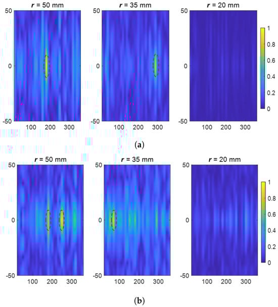 For the first Measurement Example, the OUTs are in the form of cylinders with a height of 50 mm and a diameter of 20 mm, placed at the cylindrical coordinates () of (35 mm, 290 deg, 0) and (50 mm, 180 deg, 0). The mechanical scanning along the z axis is performed from −80 mm to 80 mm with 31 steps. Figure 9a shows the reconstructed images of the positioned objects in the imaged medium. Despite the inevitable presence of environmental interferences and measurement noise, the objects are clearly distinguishable in the images.