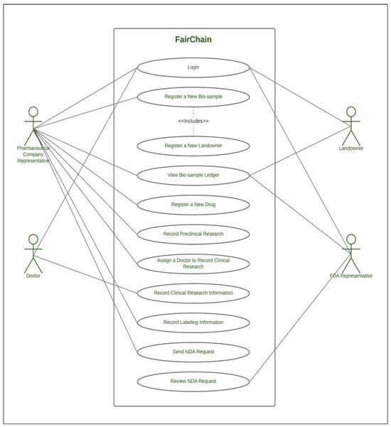 FairChain is designed for the following user categories: pharmaceutical company representatives (Pharmaceutical for short), reviewers (Reviewer for short), bio-sample landowners (Landowner for short), and healthcare practitioners (Doctor for short). All system users are able to login using their usernames and passwords for authentication and authorization (with their main credentials issued by an administrator), while Landowner users login using only their national identification credentials. The Pharmaceutical category represents the main users of FairChain, who are responsible for registering new bio-samples and assigning them to a Landowner as well as for registering a new drug, recording preclinical research and labeling data, and finally applying for a New Drug Application request. The Pharmaceutical user is a skilled person with high technical expertise. Both Doctor and Reviewer user categories also consist of highly skilled users with technical expertise. Reviewer users are responsible for approving or denying a New Drug Application request and viewing the bio-sample ledger, while Doctor users mainly record clinical research data. Users in the Landowner category use FairChain to view the bio-sample ledger, and are expected to have low- to-mid-level technical skills. The full use case showing all the actors and respective cases is illustrated in Figure 2.