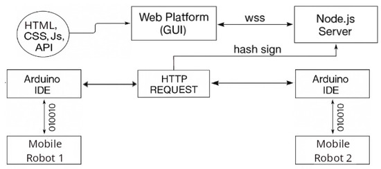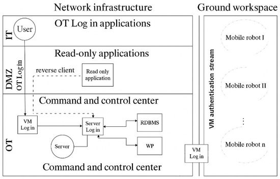 As previously discussed, this study proposes the integration of a server–client-based robotic network within the OT domain using virtualization technologies. The architecture defines the connection between the server and its clients, including mobile robots and web browsers, through Wi-Fi communication.