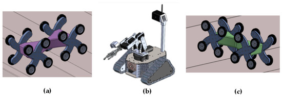 Mobile robot clients. (a,c) Legged-wheel mobile robot [15]; (b) tracked mobile robot.