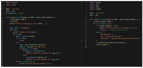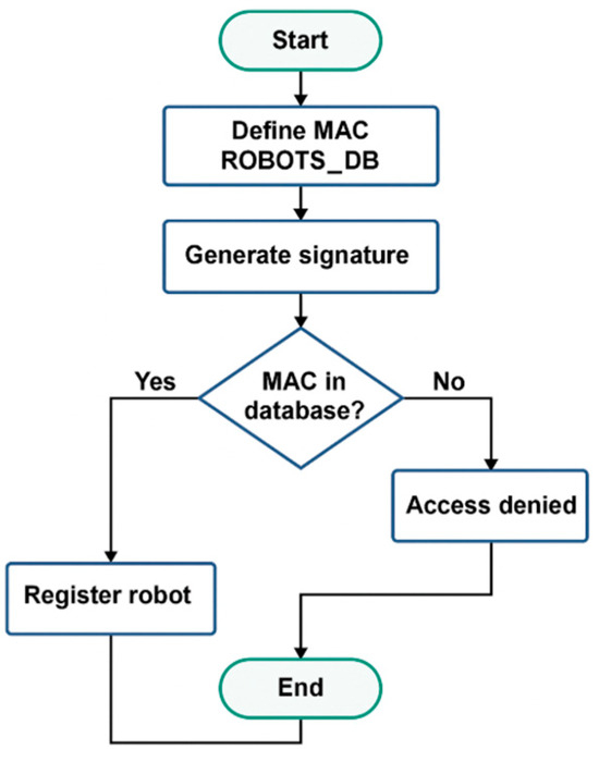 Figure 4 illustrates the logic of the secure registration process implemented in the proposed mobile robotic network. Each robot is uniquely identified by its microcontroller’s MAC address, which serves as the basis for generating a digital signature used in the authentication phase. The corresponding pseudocode present in Algorithm 1 formalizes this process by defining the internal MAC address registry, the local signature generation method on the robot side, and the server side validation and registration procedure. If the received MAC address is found in the server’s database and the signature matches the expected result, the robot is authenticated and formally registered in the network. Otherwise, access is denied, thus ensuring both identity verification and communication integrity.
