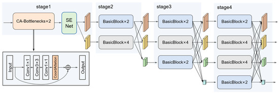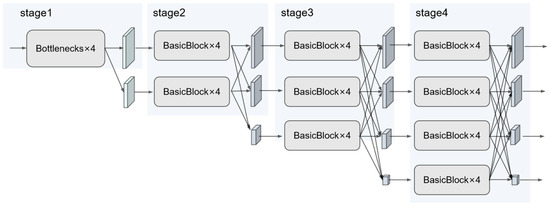 HRNet’s core design philosophy involves maintaining high-resolution features and enabling multi-scale interaction. Traditional models, such as U-Net, lose detailed information due to the successive downsampling and upsampling in their encoder-decoder structures. In contrast, HRNet employs a parallel architecture with multi-resolution subnets. It keeps high-resolution feature streams in all four of its stages. It enhances semantic expression through cross-resolution feature fusion techniques, such as bilinear interpolation combined with convolution [10,11]. HRNet’s multi-stage parallel architecture, whose structure is shown in Figure 2, has subnetworks at different resolutions (e.g., 1/4, 1/8, 1/16, and 1/32) at each stage. These subnetworks exchange information via repeated multi-scale fusion modules [10,12]. Moreover, HRNet’s feature aggregation strategy upsamples low-resolution features to high-resolution features and then adds them element-wise. This element-wise addition operation preserves spatial details while incorporating deep semantics, significantly improving edge and small-object segmentation accuracy in datasets such as Cityscapes and ADE20K [13]. The model’s scalability further enables performance enhancement through subnet branch augmentation or the integration of attention mechanisms for refining complex-scene features.