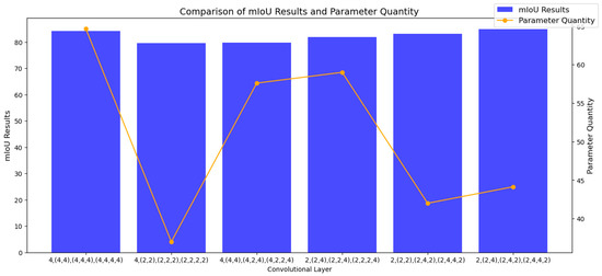 Figure 5 clearly presents a comparison of the mIoU values and parameter quantities for various convolutional layer setups in HRNet-w48. The blue bars represent the mIoU values, which reflect the segmentation accuracy, whereas the orange line indicates the parameter quantity. Each data point corresponds to a specific configuration of a convolutional layer.