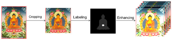 The collected Thangka images were resized to meet the input specifications of the deep-learning models, so they were resized to 512 × 512 pixels. Thangka artworks feature a unique composition, where central cropping might lead to the loss of critical details, especially those related to the main deity and ritual implements. Therefore, a specialized cropping method was adopted. First, the images were shifted upward by 15%, and then cropping was performed based on this new central point. This approach effectively preserved key elements, particularly the ritual implements surrounding the main deity. After cropping, the LabelMe tool—enhanced with the AI large model SAM [27]—was used to conduct pixel-level semantic annotation of the ritual implements in each Thangka image.