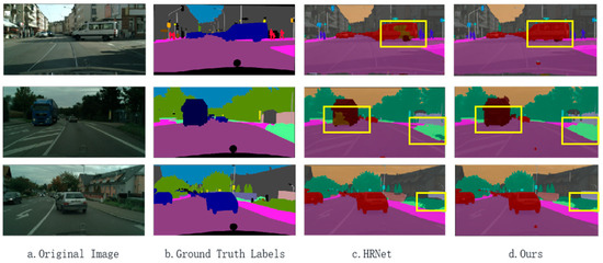 After the HRNet model was improved, it also demonstrated excellent performance on the Cityscapes dataset. By more effectively capturing multi-scale features and enhancing channel information, the improved model achieves higher segmentation accuracy and better detail capture capabilities when dealing with complex urban street scenes, particularly when handling boundaries and small objects. These enhancements enable the model to perform better in the semantic segmentation task on the Cityscapes dataset, as shown in the visualization results in Figure 11.