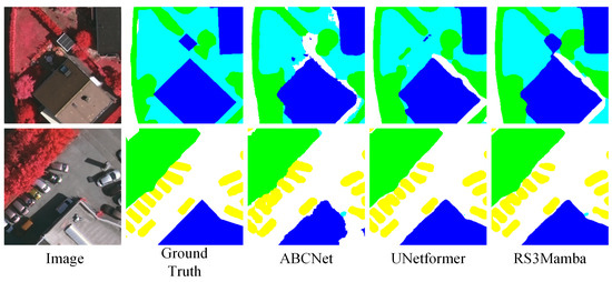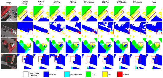 Qualitative performance comparisons on ISPRS Vaihaigen with a size of 256 × 256.