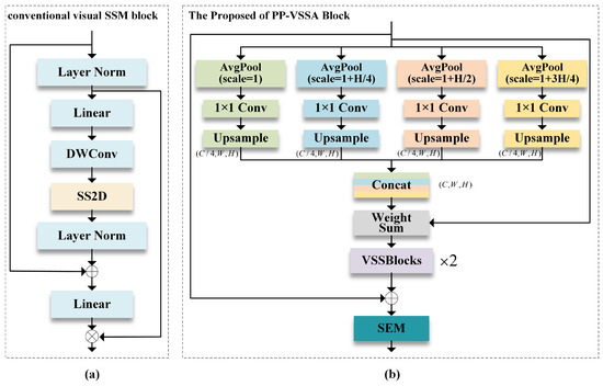 The architectures of the conventional visual SSM block and the proposed PP-VSSA block. (a) The architecture of the conventional visual SSM block. (b) The proposed architecture of the PP-VSSA block.