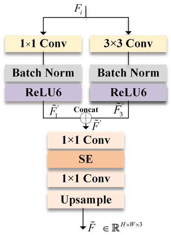 The Auxiliary Local Supervision (ALM) block is shown in Figure 5. It uses two parallel convolution branches. One path uses the convolution kernel of 1 × 1, and the other uses the convolution kernel of 3 × 3 to process the input features. Subsequently, the feature maps processed by the two branches are spliced in the channel dimension. The spliced features are adjusted by the 1 × 1 convolution to optimize the feature representation, and the SE attention [40] module is introduced to model the channel dependency. Finally, after 1 × 1 convolution processing and upsampling, the final output feature is obtained.
