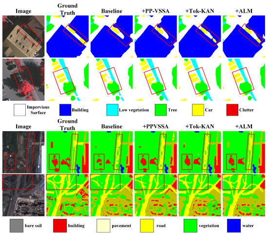To intuitively demonstrate the contribution of each module, we present a comparative visualization of segmentation results for four representative test regions in Figure 9, covering challenging scenarios including shadow occluded cars (Case #1), boundaries of adjacent objects (Case #2), and complex road networks (Cases #3 and Case #4). The results clearly indicate that PP-VSSA significantly enhances target recognition—as shown in Row 2 of Figure 9, its integration enables more accurate identification of small targets like cars compared to the baseline network, demonstrating that multi-scale fusion and attention complementarity improve recognition accuracy. Tok-KAN achieves efficient nonlinear modeling through a learnable function approximation mechanism, enhancing the model’s ability to capture local variations and nonlinear patterns, which is particularly advantageous for identifying small or camouflaged objects. For instance, in Row 1 of Figure 9, Tok-KAN correctly detects shadowed vehicles for the first time, while the baseline model overlooks these details. Serving as an auxiliary supervision head for shallow features, ALM further refines object contours and enhances edge detail recognition, with its improvements most evident in complex road segmentation (Rows 3–4 of Figure 9). As illustrated in Figure 9, our model demonstrates superior performance in identifying small objects (e.g., vehicles and rooftops) compared to baseline methods. The visual results highlight its capability to localize small targets while effectively handling adjacent object boundaries accurately, conclusively validating the efficacy of PP-VSSA, Tok-KAN, and ALM in enhancing small target recognition and resolving ambiguous object boundaries.