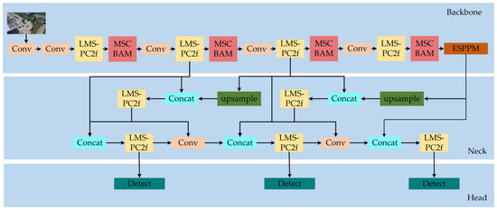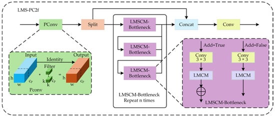 The improved LMS-PC2F module is shown in Figure 5. Combining the advantages of LMSCM-Bottleneck and PConv, it can capture and fuse multi-scale features more efficiently, ensure that the output of each feature block is fully integrated, and further enhance the expressive ability and feature learning ability of the model. Additionally, the module optimizes occlusion handling in UAV imagery, improves detection precision, and reduces parameter count, making it highly suitable for deployment on storage-constrained edge devices.