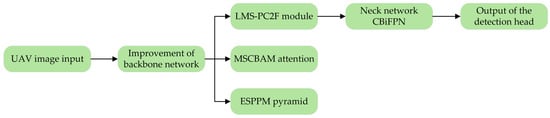 To address the limitations of inaccurate localization, missed detections, and false positives in drone imagery object detection with the YOLOv8n baseline model, this paper proposes LMEC-YOLOv8—an enhanced YOLOv8n-based model for UAV target detection, whose architecture is depicted in Figure 2. The methodology begins by designing a Lightweight Multi-scale Convolution Module (LMSCM) to replace the second convolution in the C2F bottleneck, integrating Partial Convolution (PConv) to form the Lightweight Multi-scale Fusion of PConv-based C2F (LMS-PC2F), thereby improving feature representation accuracy. Subsequently, a Multi-scale Convolutional Block Attention Module (MSCBAM) is developed through enhancements to CBAM, which is embedded into the backbone network to augment detection precision, robustness, and multi-scale feature extraction capabilities. Further innovation involves the design of an Enhanced Spatial Pyramid Pooling Module (ESPPM), where adaptive average pooling and Large Separable Kernel Residual Attention Mechanisms are introduced into the SPPF structure to preserve fine-grained image features while enabling efficient multi-scale feature fusion. Finally, the original neck network is replaced with a Cross-layer Bidirectional Feature Pyramid Network (CBiFPN), which facilitates hierarchical semantic interaction through weighted cross-level feature fusion, effectively addressing challenges posed by scale variations and occlusions. The research process is shown in Figure 3.