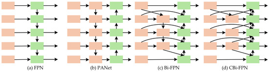 However, as network depth increases, the aforementioned feature fusion structures lead to partial loss of detailed features across network layers, resulting in insufficient accuracy in recognizing small target characteristics within complex scenes and ultimately lower detection precision. To address this issue, this study introduces a Cross-layer Weighted Bidirectional Feature Pyramid Network (CBiFPN) to replace PANet. Building upon BiFPN, CBiFPN incorporates an additional cross-layer data flow connection (as shown in Figure 9d), which reduces the loss of fine-grained feature information for small targets and significantly enhances the network’s expressive capability.