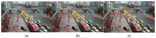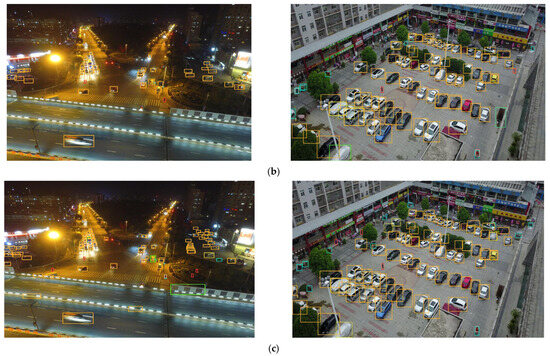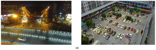 It should be noted that the targets visualized in Figure 10 (e.g., pedestrians, small vehicles) from the VisDrone2019 dataset are predominantly moving at low speeds or are relatively static. Significant motion blur from high-speed targets (e.g., racing cars) was not a primary factor in these specific examples or in the overall quantitative evaluation of the dataset.