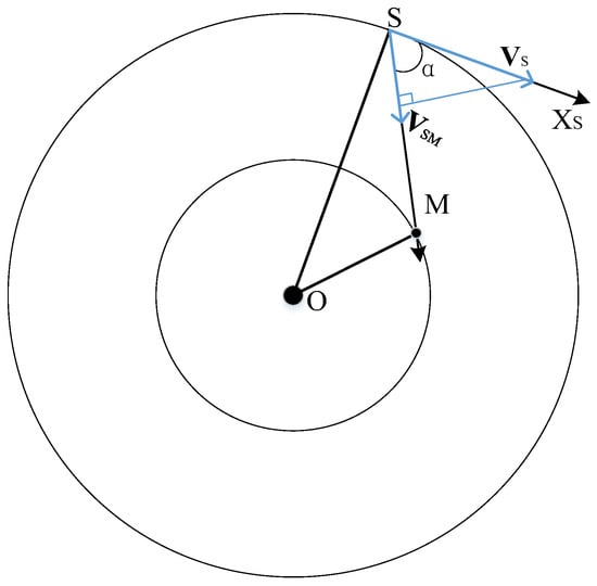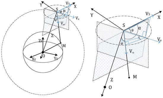 - Then, the velocity is projected onto the straight line SM. According to the included angle φ between and the straight line SM, φ is the elevation angle in the satellite antenna’s coordinate system. The following can be obtained:where is the radial velocity of the satellite’s velocity along the straight line SM, and the following is obtained: