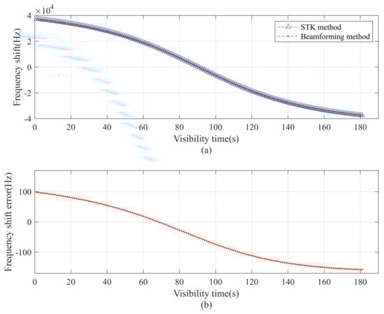 When the minimum elevation angle of the satellite is 0° and the geographical latitude of the terminal is 0°, the Doppler frequency-offset estimation of the satellite beam-pointing method is shown in Figure 4. Figure 4 compares the simulation results of the satellite beam-pointing method with STK simulation results. Within the visible time of the satellite, the range of frequency-offset estimation error is [−150 Hz, +150 Hz].