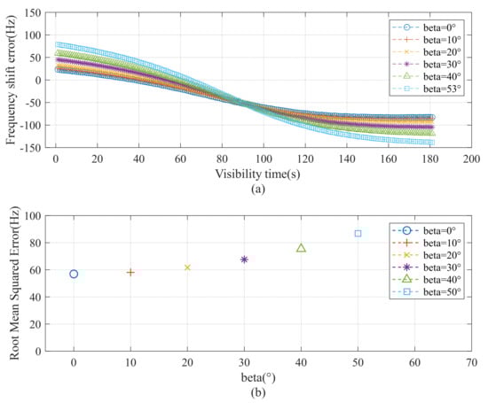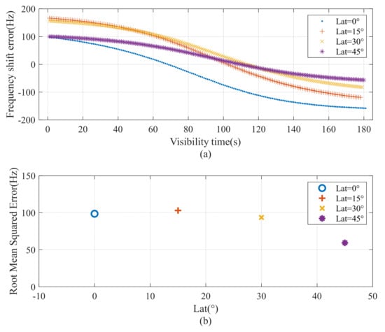Doppler frequency-shift simulation and error statistics at different satellite geocentric latitudes. (a) The Frequency shift error; (b) The Root Mean Squared Error.