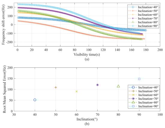 Simulation results of the RMSE of frequency-offset estimations for different orbital inclinations. (a) The Frequency shift error; (b) The Root Mean Squared Error.
