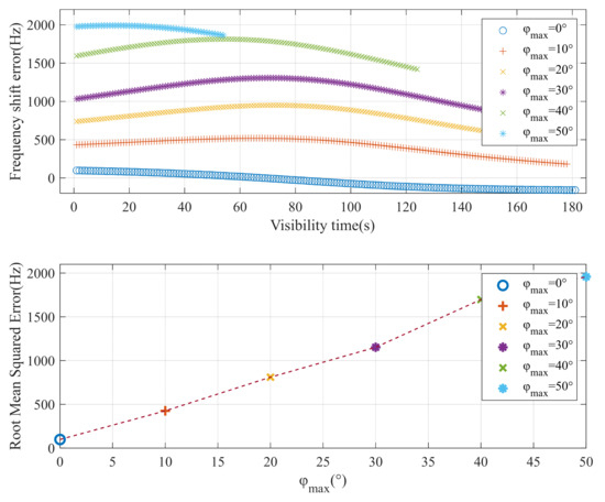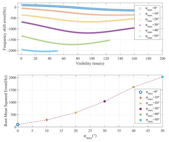 - When the satellite geocentric latitudes are set to 0°, 10°, 20°, 30°, 40°, and 50°, compare the frequency-offset estimation error between the Doppler frequency-offset estimation based on STK simulations and the Doppler frequency-offset estimation based on the DFS-BP method. The differences among the three sub-equations in Equation (30) are analyzed through the RMSE of the frequency-offset estimation errors.