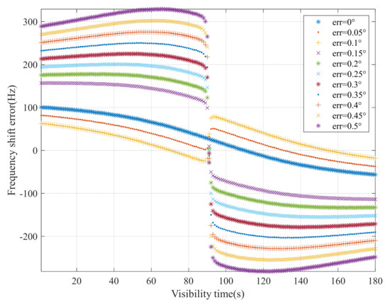 represents the minimum elevation angle of the satellite. is set at 0°, 10°, 20°, 30°, 40°, and 50°. When the azimuth angle is less than 180°, the Doppler frequency-offset estimation error of the satellite beam-pointing method is shown in Figure 9. It can be seen from Figure 8 that the frequency-offset estimation error range of the two methods is between [−200 Hz, +2000 Hz] in the whole visible period. When the azimuth angle is less than 180°, the positive deviation error of the frequency-offset estimation increases with an increase in the minimum elevation angle of the satellite.