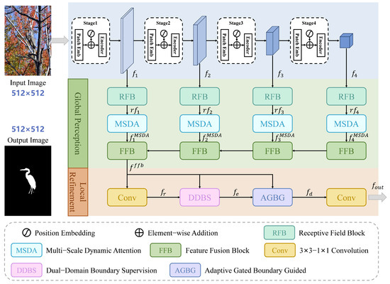 Figure 2 illustrates the overall architecture of the proposed SFNet. It is composed of two main phases: global perception and local refinement. The pre-trained PVTv2 [34] is employed as the backbone to extract features at multiple levels from the input image, represented as f i , i { 1 , 2 , 3 , 4 } . In the global perception phase, these multi-scale features are first processed by Receptive Field Block (RFB) [35] to generate a collection of enhanced features r f i , i { 1 , 2 , 3 , 4 } . These enhanced features then pass through the MSDA module that utilizes a dynamic attention mechanism to perform the localization and feature optimization of camouflaged objects. This mechanism combines multi-scale information [36] with an attention mechanism that integrates frequency channel attention [37] and spatial attention [38]. Subsequently, the Feature Fusion Block (FFB) aggregates the multi-scale features to produce a rough segmentation result. In the local refinement phase, we introduce the DDBS module, which enhances boundary information by jointly optimizing features in both the spatial domain and frequency domain, thereby capturing more accurate and detailed object boundaries. Eventually, the AGBG module adaptively fuses the body and boundary features of the object, generating the final camouflaged object detection result while preserving global semantic consistency.