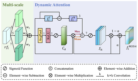 Figure 3. Details of the proposed MSDA. We leverage multi-scale information to facilitate the recognition of object size and position and introduce a dynamic attention mechanism to selectively highlight target regions, thereby enhancing the discriminative feature representation.