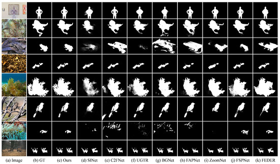 60. Xing, H.; Gao, S.; Wang, Y.; Wei, X.; Tang, H.; Zhang, W. Go closer to see better: Camouflaged object detection via object area amplification and figure-ground conversion. IEEE Trans. Circuits Syst. Video Technol. 2023, 33, 5444–5457. [Google Scholar] [CrossRef]