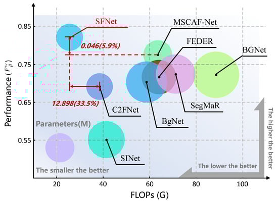 Figure 7. Comparison of our method with other state-of-the-art methods for COD10K-Test in terms of Performance ( F β w ), Parameters, and FLOPs.