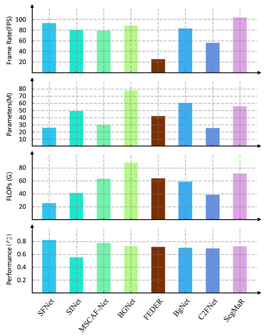 Figure 8. Parallel histogram comparison of Performance ( F β w ), Parameters (M), FLOPs (G), and Frame Rates (FPS).