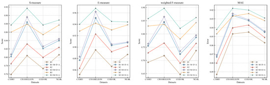 Figure 10. Quantitative analysis of the effectiveness of PVTv2. B1, B2, and B3 denote ResNet/Res2Net/PVTv2+RFB+FFB, respectively. The abbreviations M, D, and A stand for the multi-scale attention module, the dual-domain boundary supervision module, and the sdaptive gated boundary guided module.