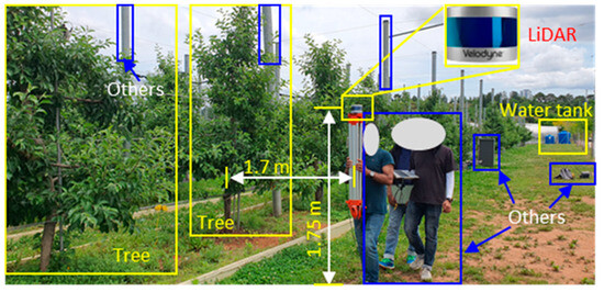 Data collection involved scanning the apple trees, including objects in the apple orchard, such as water tanks and concrete posts, and the visibility of humans as dynamic objects engaged with data collection for object detection. The LiDAR system was carefully configured to ensure accurate and reliable data acquisition. The setup featured LiDAR as the core device for capturing 3D spatial information. Additional components included a terminal box for managing the sensor data stream, a laptop for collection, visualization, and pre-processing, and a 12 V battery for supplying power to the entire system. For operational stability, the LiDAR was securely attached to a fixed plate on the tripods. Figure 2 presents a schematic representation of the system configuration, highlighting the integration of each component to enhance the data acquisition efficiency and overall system performance. Figure 3 illustrates the data collection of apple trees and other objects using LiDAR. According to the average tree height, the LiDAR was positioned 1.75 m above the ground, and the lateral distance from the sensor to the central axis of the tree rows was 1.7 m for side-view scanning. The collected raw data were saved in the PCAP format. The sensor was manually moved to capture the tree-side profiles during data collection. The FOV was fixed to cover the entire tree height and object classes in the orchard. The HFOV was set to 360° to capture both the left and right sides of the objects to be detected. Additionally, an external global positioning system (GPS) (model: GPS18x LVC, Garmin Ltd., Olathe, KS, USA) was integrated into the setup for accurate geolocation and synchronization of data. For data acquisition, open-source software (Veloview, Ver. 5.1.0, Kitware, Inc., Clifton Park, NY, USA) was utilized. This software enabled the real-time visualization, selection, and interpretation of LiDAR data, including distance measurements, return intensity, laser ID, return type, azimuth, time, and distance. It also offers export functions for point cloud data in CSV format, including x, y, and z coordinates. Commercially available open-source software (model: Veloview, Ver 5.1.0, Kitware, Inc., Clifton Park, NY, USA) and the programming language Python (ver. 3.11.5) were used to convert the captured data and pre-process them into usable 3D point cloud formats, respectively. The software supports the visualization, detailed analysis, and spatial measurement of data [56].