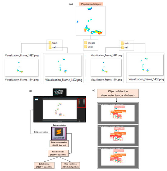 The preprocessing of LiDAR data for annotation using an open-source annotation tool. (a) Annotation of dataset for training and validation, (b) data training and validation by model run, (c) object detection.