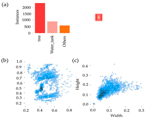 Figure 7a shows a bar chart representing the total number of labeled instances across the entire dataset (training and validation). Trees had over 2000 instances, water tanks had around 1000 instances, and other object instances had around 500. The total number of instances was around 3500 labeled objects across all images, creating a class imbalance. This may lead to higher accuracy for trees but more errors in the other categories because highly imbalanced datasets present significant challenges, as most learning algorithms tend to favor the majority class, often leading to poor performance in minority classes [72]. The scatter plots show the object size distribution. Most of the detected objects had consistent widths and heights, which helped the model to learn the object features effectively. In Figure 7b, the left scatter plot shows a common placement pattern, while the right scatter plot in Figure 7c confirms that most bounding boxes are similar in size.