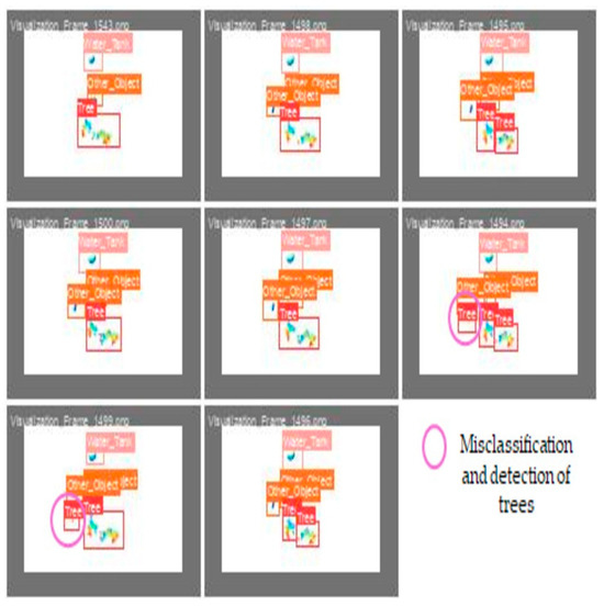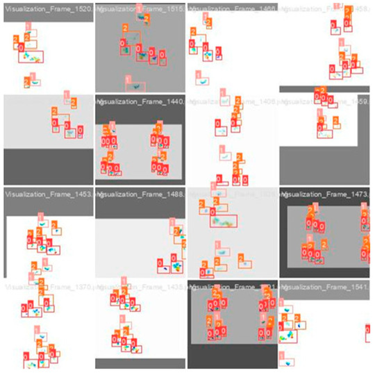 The validation dataset is crucial for assessing the YOLOv5 model performance in object detection, contributing to accuracy and robustness. The performance was evaluated over the training and validation datasets. Figure 9 shows the dataset for object detection using the YOLOv5 model through training and validation. The pre-processed images were formatted to align with the input requirements of YOLOv5 to ensure consistency with the training data. Extracted from point cloud data, such as those obtained through LiDAR sensing, the dataset contained color-coded objects representing trees, water tanks, and others. The bounding boxes and ground truth labels of the dataset allowed for the direct measurement of performance through precision, recall, F1-score, and mean average precision (mAP). As a structured benchmark, it ensured evaluation, which helped to identify misclassifications and detection performance.