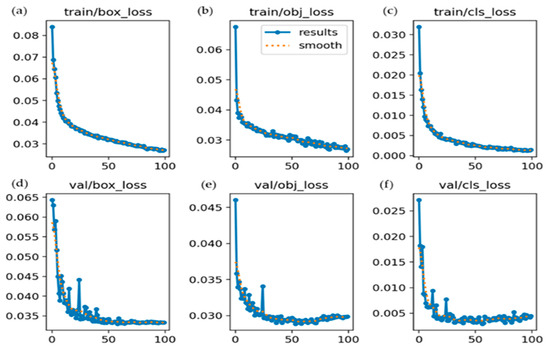 The 300 images represented the total number of images utilized for validation, while 949 instances indicated the total number of labeled objects across those validation images. The final model performance is summarized in Table 2, showing high precision (90.3%) and recall (87.1%), indicating accurate detection with a balanced rate of false positives and negatives. A strong mAP@50 of 89.2% was achieved by the model, reflecting reliable object detection at a 50% IoU threshold. A low classification loss (0.001) further supported the effectiveness of the model. However, the lower mAP@50–95 score (47.8%) suggests reduced accuracy with stricter localization requirements. Overall, the model demonstrated robust performance, although further improvements, such as parameter tuning, dataset expansion, or higher input resolution, may enhance detection under more challenging conditions. The loss progression curves for both the training and validation of the YOLOv5 model across all 100 epochs are depicted in Figure 10. The figure shows that all loss components decreased steadily and converged smoothly, indicating stable model optimization and minimal risk of overfitting. The alignment between the training and validation losses suggests a good generalization performance across the dataset.