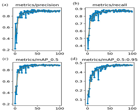 Figure 11 illustrates the evolution of four key evaluation metrics, namely P, R, mAP@0.5, and mAP@0.5:0.95, over the course of 100 training epochs for the YOLOv5 model. As shown in Figure 11a, the precision curve exhibited early instability, followed by a rapid ascent, ultimately plateauing near 0.90. This reflects the increasing ability of the model to minimize false positives and generate reliable detections. In Figure 11b, recall improves markedly from an initial value of approximately 0.35 to nearly 0.90, indicating enhanced sensitivity and a reduction in false negatives as the training progresses. The mAP@0.5 curve in Figure 11c shows a consistent upward trend, reaching approximately 0.90, which signifies effective object localization and classification at a 50% Intersection over Union (IoU) threshold. In contrast, the mAP@0.5:0.95 curve in Figure 11d increased more gradually and converged around 0.48. This metric, which is more stringent, highlights the moderate performance of the model in achieving precise localization across a range of IoU thresholds. Collectively, these trends suggest that the model underwent stable optimization and achieved a strong generalization performance. However, the relatively lower mAP@0.5:0.95 underscores the need for further refinement in bounding box regression or anchor box tuning to enhance the localization precision under stricter evaluation criteria. However, some scattered points suggest misclassification or variations in object size. Adjusting the anchor boxes or using data augmentation may help improve performance.