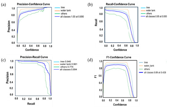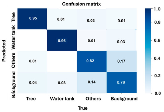 The confusion matrix, as shown in Figure 13, provides a detailed evaluation of the classification performance across different object categories, which achieved an overall accuracy of 89% (mAP@50) with a class loss of 0.001. The model exhibited a high detection accuracy for water tanks (96%), with 1% misclassified as trees and 3% as background, demonstrating strong detection accuracy in distinguishing this class. Similarly, trees were correctly identified with 95% accuracy, with 1% misclassified as other objects and 4% as the background, indicating reliable detection. However, the class defined as “others” showed a lower classification accuracy of 82%, with 3% misclassified as trees, 1% as water tanks, and 14% as background, highlighting the challenge of distinguishing these objects due to their similarity with background elements. Additionally, some background regions were misclassified as trees (4%), water tanks (3%), and others (14%). These findings aligned with the high detection accuracy where trees (95%) and water tanks (96%) were achieved, while the “others” class presented a higher misclassification rate of 18% (3% misclassified as trees, 1% as water tanks, and 14% as background). The confusion matrix shows that the model performed well in detecting clearly defined objects, such as trees and water tanks, with high accuracy due to their distinct shapes and consistent features. In contrast, the “others” class has a lower accuracy because it includes various objects with visual heterogeneity, making it harder for the model to learn clear patterns. Many of these objects also resemble the background elements, leading to misclassifications. Background areas were sometimes predicted as objects due to visual similarity or labeling issues. Although the overall class loss was low, these results suggested that the model struggled with classes that showed high variability or overlap with the background.