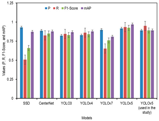 YOLOv5 model object detection performance was evaluated using standard classification metrics, such as accuracy, precision (P), recall (R), mean average precision (mAP), and F1-score. Precision quantifies the proportion of identified objects relevant to the total number of predicted objects, while recall measures the percentage of correctly identified objects out of the total number of ground truth instances. The mAP evaluates the detection accuracy of the model by calculating the average precision across all categories, considering predictions with an intersection over union (IoU) greater than 50% to be correct detections. A higher mAP value indicates improved detection performance and higher prediction reliability. These metrics are calculated using Equations (6)–(10) [18,68,69].