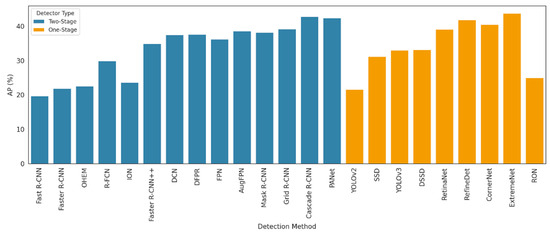Object detection algorithms are generally categorized into two stages: one- and two-stage [18,19]. The one-stage object detection frameworks consist of models such as You Only Look Once (YOLO) [20,21,22,23,24], SSD [25], DSSD [26], RetinaNet [27], RefineDet [28], whereas two-stage algorithms mainly include R-CNN [29], Fast R-CNN [30], Faster R-CNN [31,32], and Mask R-CNN [33]. One-stage algorithms rely on regression techniques to directly predict detection results, which possess a high speed of detection; however, they often struggle to accurately detect small-scale objects. One-stage detection eliminates the need for candidate box generation, whereas two-stage detection algorithms generate bounding box candidates and then classify objects within them. It offers high accuracy and robustness with low error rates [34,35]; however, it requires more time for processing, making them less suitable for applications in real-time detection. Several one-stage (e.g., SSD and YOLO) and two-stage (e.g., Faster R-CNN and Mask R-CNN) object detection algorithms have been applied in agricultural studies. While two-stage detectors are often more accurate, they tend to have slower inference speeds, making them less suitable for real-time field applications.