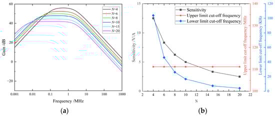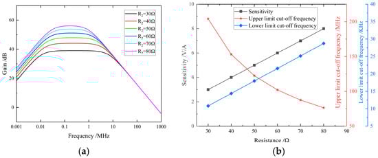 The simulation results of the sampling resistance’s influence on sensor performance are shown in Figure 8. The curves indicate that as the sampling resistance increases from 30 Ω to 80 Ω, the sensor’s sensitivity improves from 3 V/A to 8 V/A, while the upper cutoff frequency decreases from 204.12 MHz to 76.55 MHz, and the lower cutoff frequency reduces from 10.81 kHz to 28.75 kHz. The frequency response curves exhibit a leftward extension with increased peak values, showing an overall decreasing trend in bandwidth.
