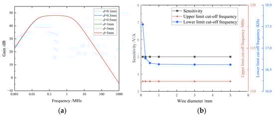 The simulation results demonstrating the impact of wire diameter variation on sensor performance are presented in Figure 4. The curves reveal that as the wire diameter increases from 0.1 mm to 5 mm, neither the cutoff frequency nor the sensitivity shows significant variation, with the frequency response remaining virtually unchanged. Since the actual variation range of wire diameter is limited in practice, the modification in wire diameter has negligible influence on both the bandwidth and sensitivity of the frequency response.