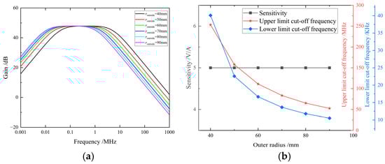 The simulation results demonstrating the impact of outer radius variation on sensor performance are presented in Figure 5. The curves reveal that as the outer radius increases from 40 mm to 90 mm, the sensitivity of the sensor is hardly affected, while the upper cutoff frequency decreases from 253.15 MHz to 52.06 MHz, and the lower cutoff frequency reduces from 40.1 kHz to 10.52 kHz. The frequency response curves exhibit a leftward shift, showing an overall decreasing trend in bandwidth.