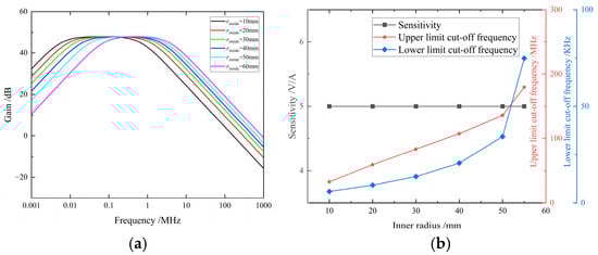The simulation results of the inner radius’s influence on sensor performance are shown in Figure 6. The curves indicate that as the inner radius increases from 10 mm to 60 mm, the sensitivity of the sensor is hardly affected, while the upper cutoff frequency increases from 32.75 MHz to 179.67 MHz, and the lower cutoff frequency rises from 5.94 kHz to 74.84 kHz. The frequency response curves exhibit a rightward shift, with an overall increasing trend in bandwidth.