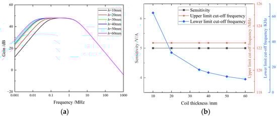 The simulation results demonstrating the impact of coil core thickness variation on sensor performance are presented in Figure 7. The curves reveal that as the coil core thickness increases from 10 mm to 60 mm, the sensor’s sensitivity and upper cutoff frequency remain unaffected, while the lower cutoff frequency decreases from 62.89 kHz to 10.5 kHz. The frequency response curves exhibit a leftward extension, showing an overall increasing trend in bandwidth.