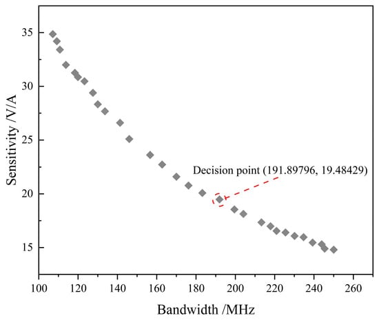 The marginal rate of substitution analysis indicates that left of this decision point, each 1 V/A sensitivity reduction yields 8.1 MHz bandwidth improvement, whereas right of this point, the same sensitivity sacrifice provides only 4.3 MHz bandwidth gain, confirming this location as the critical point of performance transition.