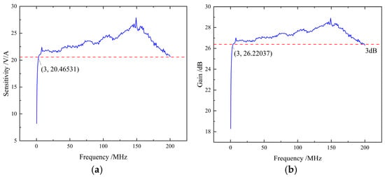 With the sampling resistor set to 50 Ω, the tested frequency response of the sensor across the 300 kHz–200 MHz range is shown in Figure 12. The frequency response curve demonstrates that the designed high-frequency current sensor maintains sensitivity no lower than 20.46 V/A within the 3 MHz–200 MHz range, exhibiting excellent signal coupling performance. Conversion of the frequency response amplitude to gain (dB) yields the gain curve, which reveals a lower −3 dB cutoff frequency of approximately 3 MHz and an upper −3 dB cutoff frequency of about 200 MHz.