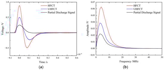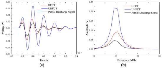 (a) Time-domain comparison waveform of 10 MHz partial discharge coupled signals. (b) Frequency-domain comparison waveform of coupled signals.