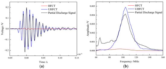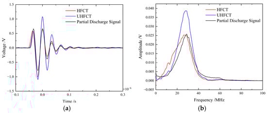 (a) Time-domain comparison waveform of 100 MHz partial discharge coupled signals; (b) Frequency-domain comparison waveform of coupled signals.