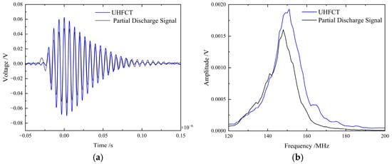 (a) Time-domain comparison waveform of 150 MHz partial discharge coupled signals. (b) Frequency-domain comparison waveform of coupled signals.